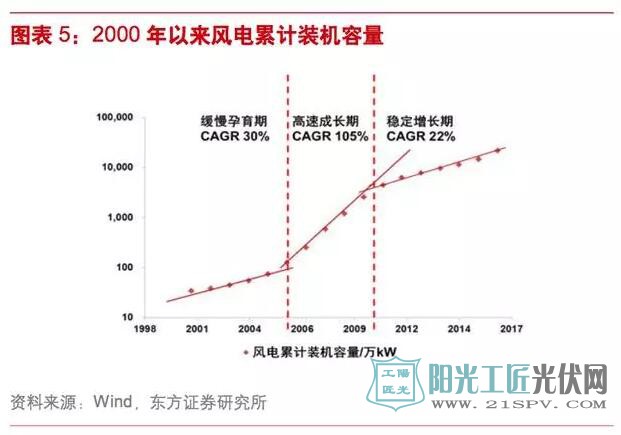 2006至2009年期间风电装机容量连续4年实现翻倍增长,2006到2010年CAGR达到105%,政策扶持是该阶段行业发展的核心驱动力。