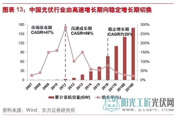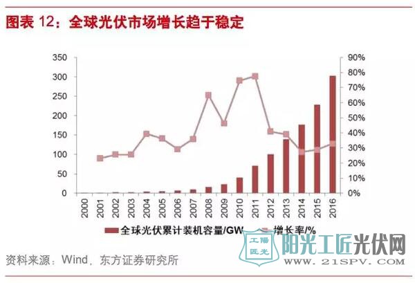 虽然光伏补贴存在退坡现象,但成本端的同步下调一定程度上保证了光伏电站的整体收益,加之在每次补贴退坡新政执行日期前出现的“抢装潮”现象,2014年以后光伏行业增长速度并没有出现明显下滑。