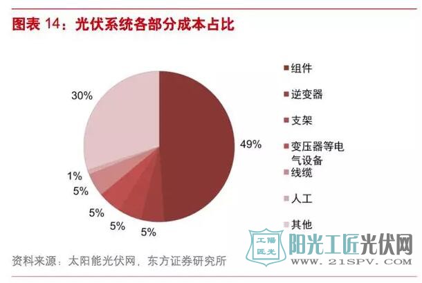 光伏系统成本主要包括组件、逆变器、支架、变压器、线缆、建筑工程费用、项目征地费用等,其中太阳能电池组件费用占整体成本的50%左右,BOS成本占比(包含控制器、支架、逆变器、蓄电池、线缆等)接近30%,其他成本包括土地、基础建设和EPC费用等。