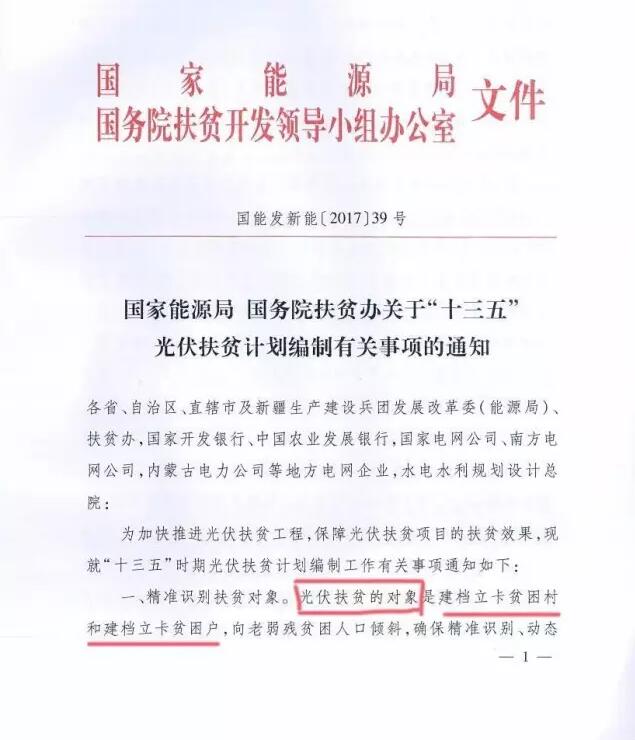 2016年12月02日,《国务院关于印发“十三五”脱贫攻坚规划的通知国发〔2016〕64号》,光伏扶贫工程。特别提到,在前期开展试点、光照条件较好的5万个建档立卡贫困村实施光伏扶贫,保障280万无劳动能力建档立卡贫困户户均年增收3000元以上。其他光照条件好的贫困地区可因地制宜推进实施。