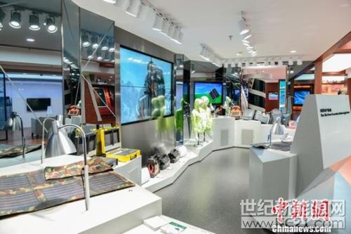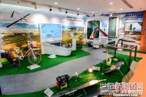 汉能展览馆展示的薄膜发电汽车车顶、无人机应用、共享单车应用等产品。中新网记者富宇摄