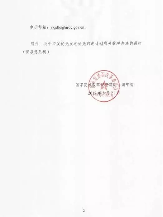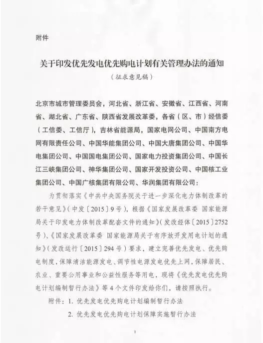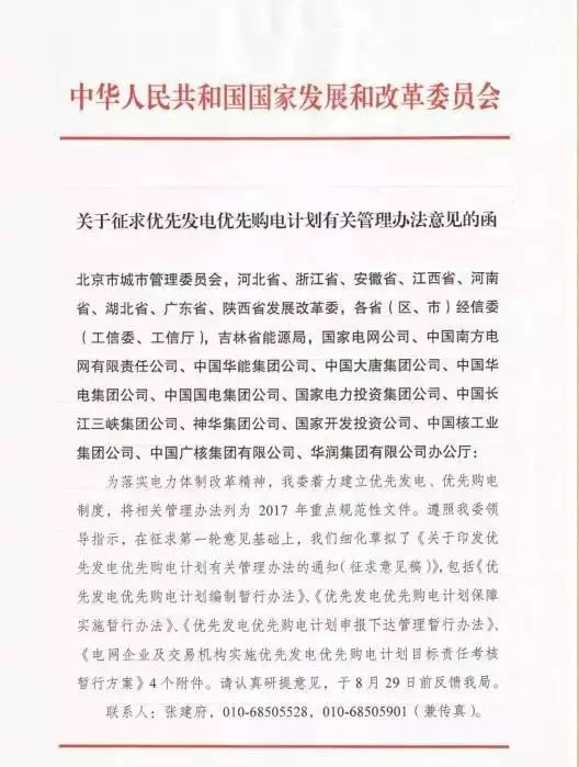 近日,国家发改委发布《关于征求优先发电优先购电计划有关管理办法意见的函》。据悉,优先发电优先购电计划有关管理办法已被列为2017年重点规范性文件,在征求第一轮意见基础上,目前已草拟了《关于印发优先发电优先购电计划有关管理办法的通知(征求意见稿)》,包括《优先发电优先购电计划编制暂行办法》、《优先发电优先购电计划保障实施暂行办法》、《优先发电优先购电计划申报下达管理暂行办法》、《电网企业及交易机构实施优先发电优先购电计划目标责任考核暂行方案》4个附件,相关征求意见应于8月29日前反馈国家发改委经济运行调节局。