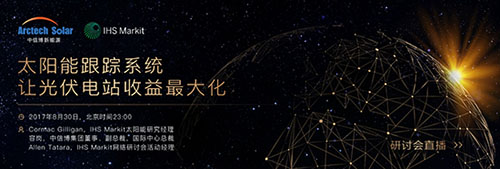 (2017年8月24日,上海)全球领先的光伏跟踪系统及固定支架生产供应商江苏中信博新能源科技股份有限公司(以下简称:中信博新能源),牵手全球知名数据咨询机构IHSMarkit,即将于8月30日,北京时间晚11点,召开线上直播研讨会,共同探讨如何用跟踪系统使光伏电站的利润和投资回报率最大化。