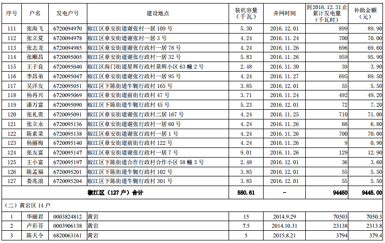2016年底前市本级个人分布式光伏发电拟补助资金项目名单