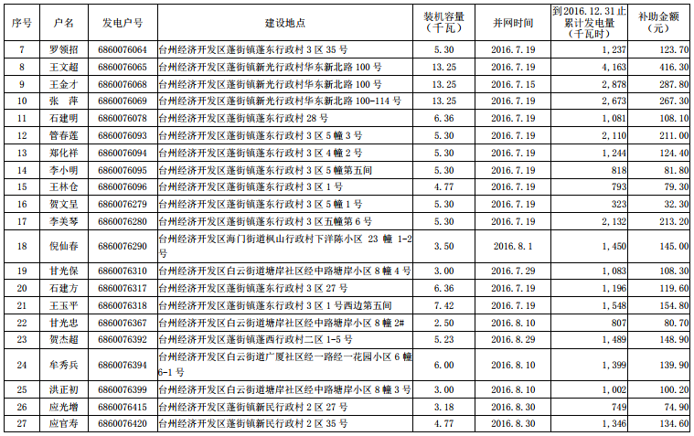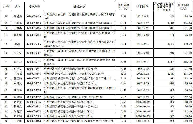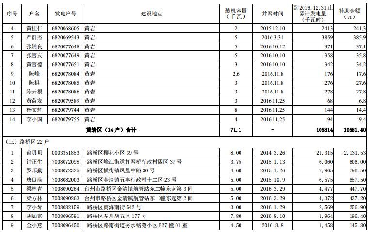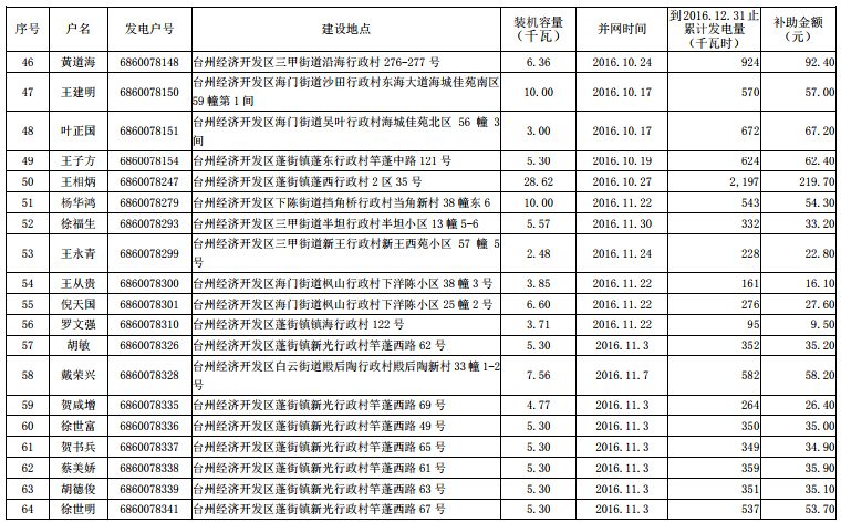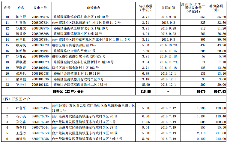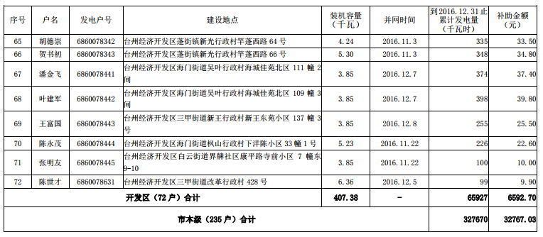 根据《台州市人民政府办公室关于扶持台州市区分布式光伏发电项目的若干意见》(台政办发〔2015〕82号)文件精神,在市本级各区发改、财政及供电部门联合申报的基础上,市发改委、市财政局和台州电业局对市本级2016年底前并网发电分布式光伏项目发电电量补助资金进行了汇总、审核,现将2016年底前市本级企业分布式光伏发电拟补助资金项目(4家)、2016年底前市本级个人分布式光伏发电拟补助资金项目(235户)名单予以公示(见附件),公示期10个工作日,即自2017年8月15日至2017年8月28 日。对公示名单有异议的,请于公示期内以实名、书面形式向台州市发展和改革委员会、台州市财政局反映,单位反映问题请加盖公章并注明联系方式,个人反映问题请署实名并提供联系方式。凡匿名提出异议的,将不予受理。