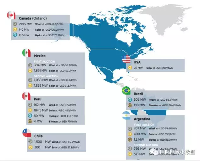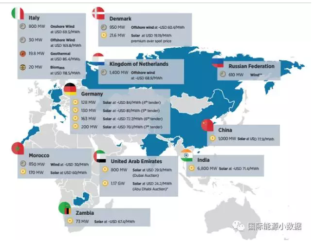根据国际可再生能源署最新发布的《可再生能源竞价分析报告》,2016年各国可再生能源项目(包括陆上风电、海上风电、光伏、水电、生物质发电、地热)最低竞价如下图所示:
