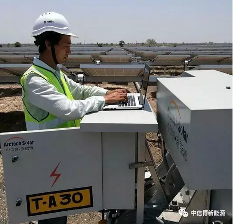 智能跟踪支架的关键核心部位之一,即控制箱部分,控制箱控制着所有的运行模式,这其中就包括了大风放平模式,每个子阵配备的风速传感器具有风速检测功能,当风速超过18m/s并且状态持续30秒时,跟踪器会将系统运行到光伏组件水平状态位置(此状态下跟踪器所受风载荷最小),当风速小于15m /s并且持续5分钟后,跟踪器即恢复到正常的跟踪状态。