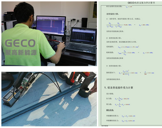 聚高拥有经验丰富的设计团队,工程师从事光伏支架设计平均超过6年。每一个项目的设计方案经过3重审核。设计过程中,工程师会对材料性能进行分析,并通过严谨的力学计算,确保能抵御12级以上的台风而不变形。此外对于重要的支架连接件,会进行极限拉拔测试。