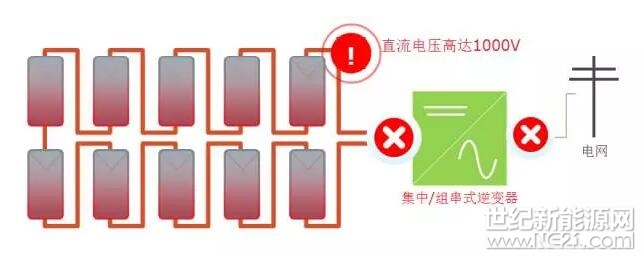 光伏系统中的高压直流电的存在是阻碍施救工作的最大因素,消灭高压直流是解决屋顶光伏电站施救问题的重要途径。目前,在欧美等发达国家,越来越多的屋顶光伏系统都采用微型逆变器取代传统的组串型逆变器。微型逆变器为全并联电路设计,组件之间不再有电压叠加,直流电压小于40伏,彻底解决了由于高压直流拉弧引起火灾的风险,同时也解决了当房屋起火时,因光伏电站而阻碍了施救的问题。