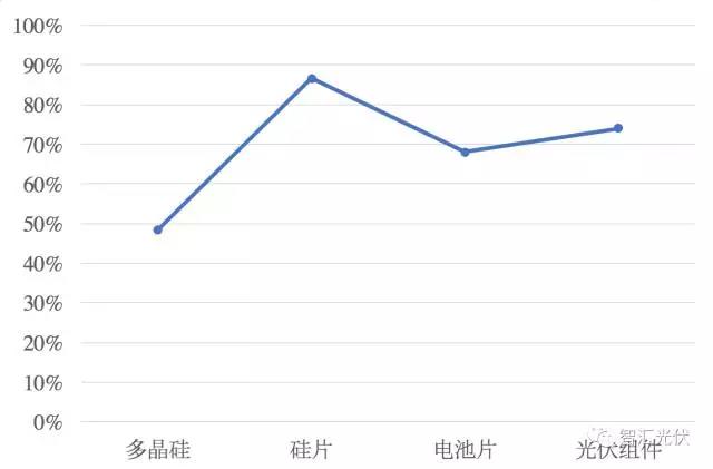 从上图可以看出,除了多晶硅以外,2017年硅片、电池片、光伏组件环节的产量,68%~87%来自中国。