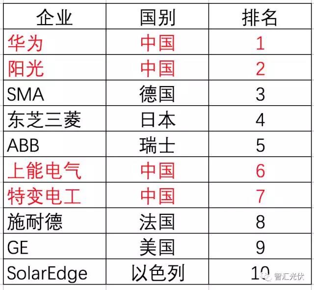 根据IHS的统计数据,2016年,中国的逆变器前企业华为、阳光销量分别位于全球第一、第二。全世界出货量前10名中,中国企业占据4席。
