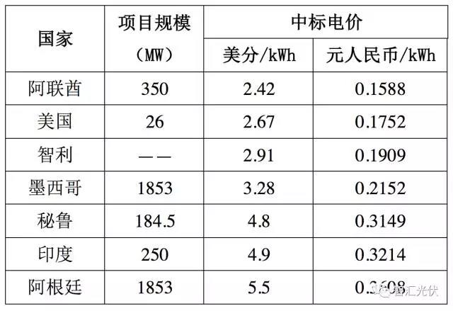 表:近期国际光伏项目的上网电价中标价格