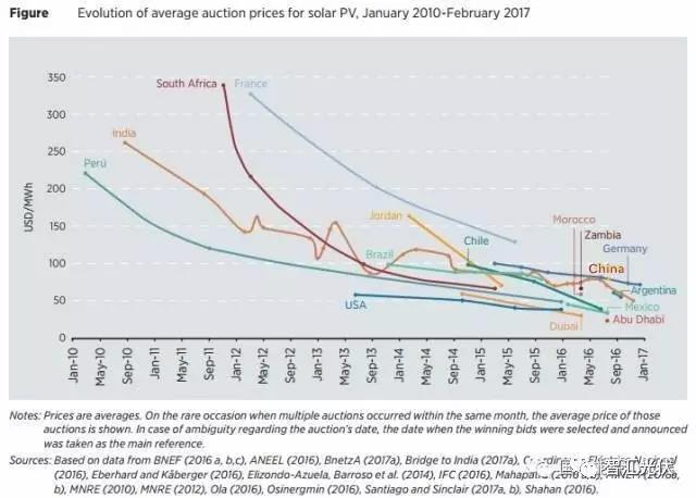 根据国际可再生能源署最新发布的《可再生能源竞价分析报告》,到2016年中已经至少有67个国家以竞价方式确定可再生能源项目。相比固定的标杆价格,可再生能源竞价有效地降低了可再生能源上网的价格。相对于2010年,6年内,光伏电价下降幅度更达到80%,为50美元/MWh(相当于人民币0.33元/kWh)。