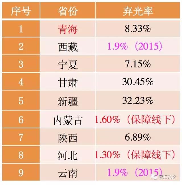 表:2016年全国各地的光伏限电率
