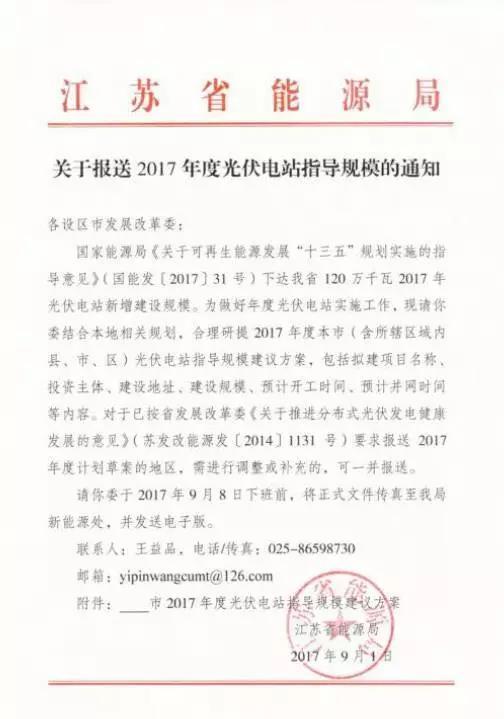 原标题:江苏能源局要求9月8日前上报各地2017光伏指标方案 总规模120万千瓦