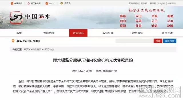近日,丽水银监分局提示辖内农金机构光伏贷款风险,针对日常监管中发现的全市农金机构光伏贷款业务增长势头总体较猛,但光伏贷款存在着安装企业资质参差不齐、缺乏行业标准,银行贷款条件设置较为随意、不够审慎,贷款风险受政策影响较大、缺乏稳定性等情况,丽水银监分局下发风险提示,要求机构严格把控光伏合作企业资质“准入关”, 密切关注光伏产业政策变化,切实加强日常监测和风险预警,防范信贷风险。