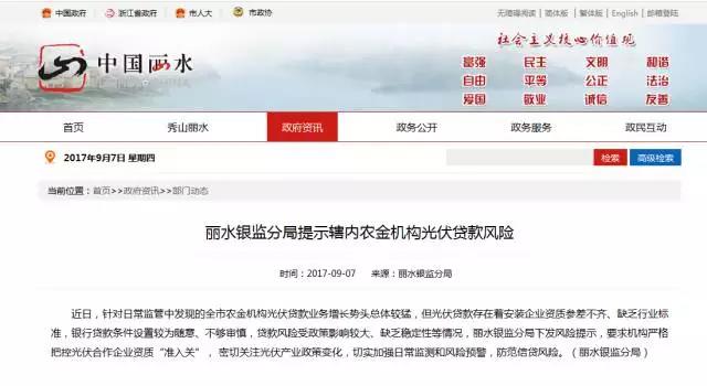 近日,丽水银监分局提示辖内农金机构光伏贷款风险,针对日常监管中发现的全市农金机构光伏贷款业务增长势头总体较猛,但光伏贷款存在着安装企业资质参差不齐、缺乏行业标准,银行贷款条件设置较为随意、不够审慎,贷款风险受政策影响较大、缺乏稳定性等情况,丽水银监分局下发风险提示,要求机构严格把控光伏合作企业资质“准入关”, 密切关注光伏产业政策变化,切实加强日常监测和风险预警,防范信贷风险。