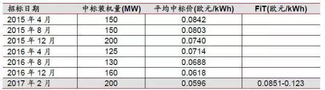竞价上网制度为政府通过招标的方式,确定最低中标价为项目的上网电价,且该电价保持若干年不变。德国2014年进行大型地面光伏电站项目的招标试点,2015年开始对100kw以上的项目实施招标制,目前对规模在750kW-10MW之间的光伏项目实施竞价上网制度,从下表可以看出德国竞价上网中标价比FiT的上限低接近60%,目前该上网电价已经在德国煤电上网电价区间内。