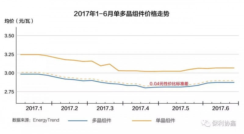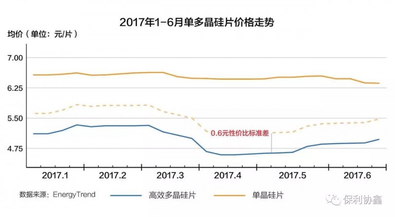 集邦新能源统计数据显示,2017上半年光伏市场,从一季度的市场淡季到二季度的6.30抢装,多晶硅片价格在4.5-5.3元/片之间,单晶硅片价格在6.3-6.5元/片之间,单晶幅度变动不大,一直处于高位。组件价格3元成为单多晶分水岭,单晶组件价格3.1-3.2元/瓦,和多晶有0.2-0.3元/瓦的价差,而且产能不足一片难求,造成了包括“领跑者”项目在内的众多设计成单晶电站无法按期完工,错失了6.30并网节点。