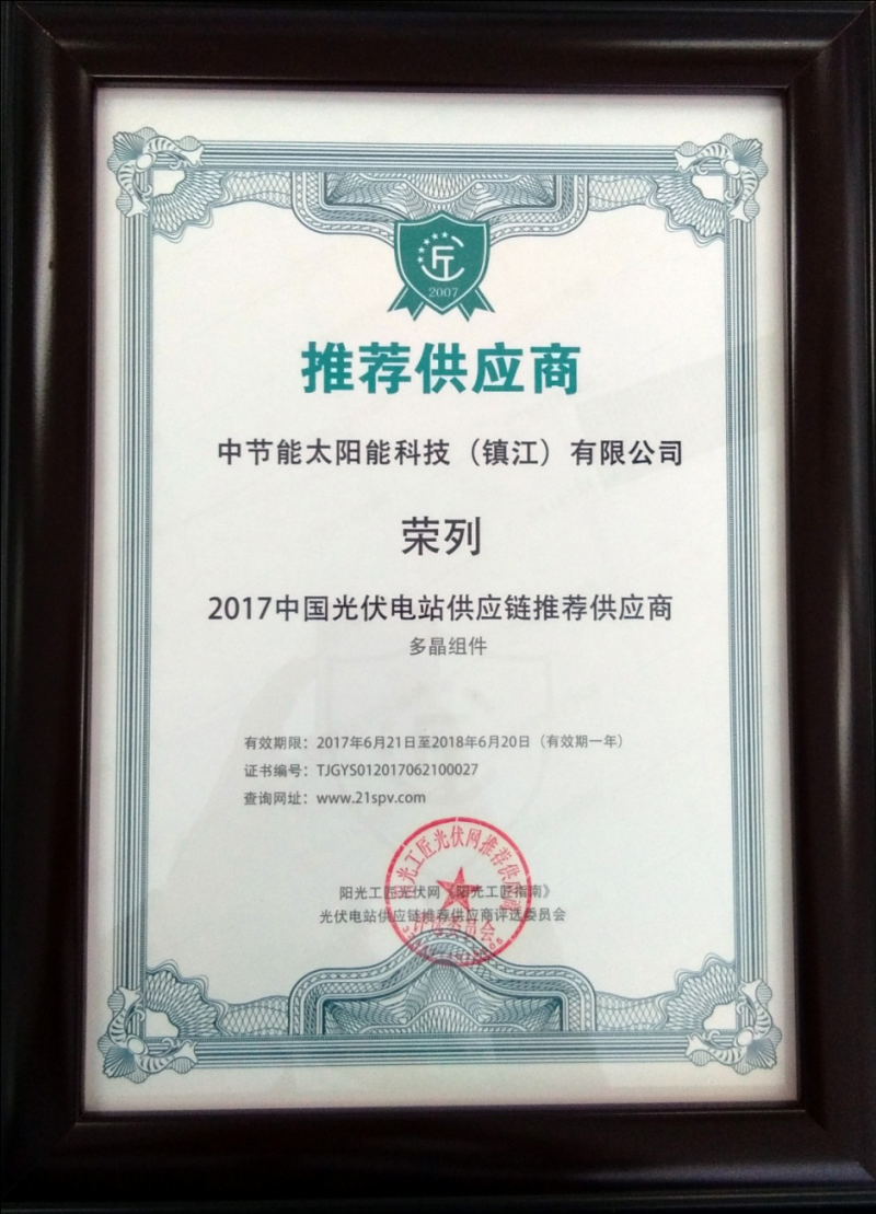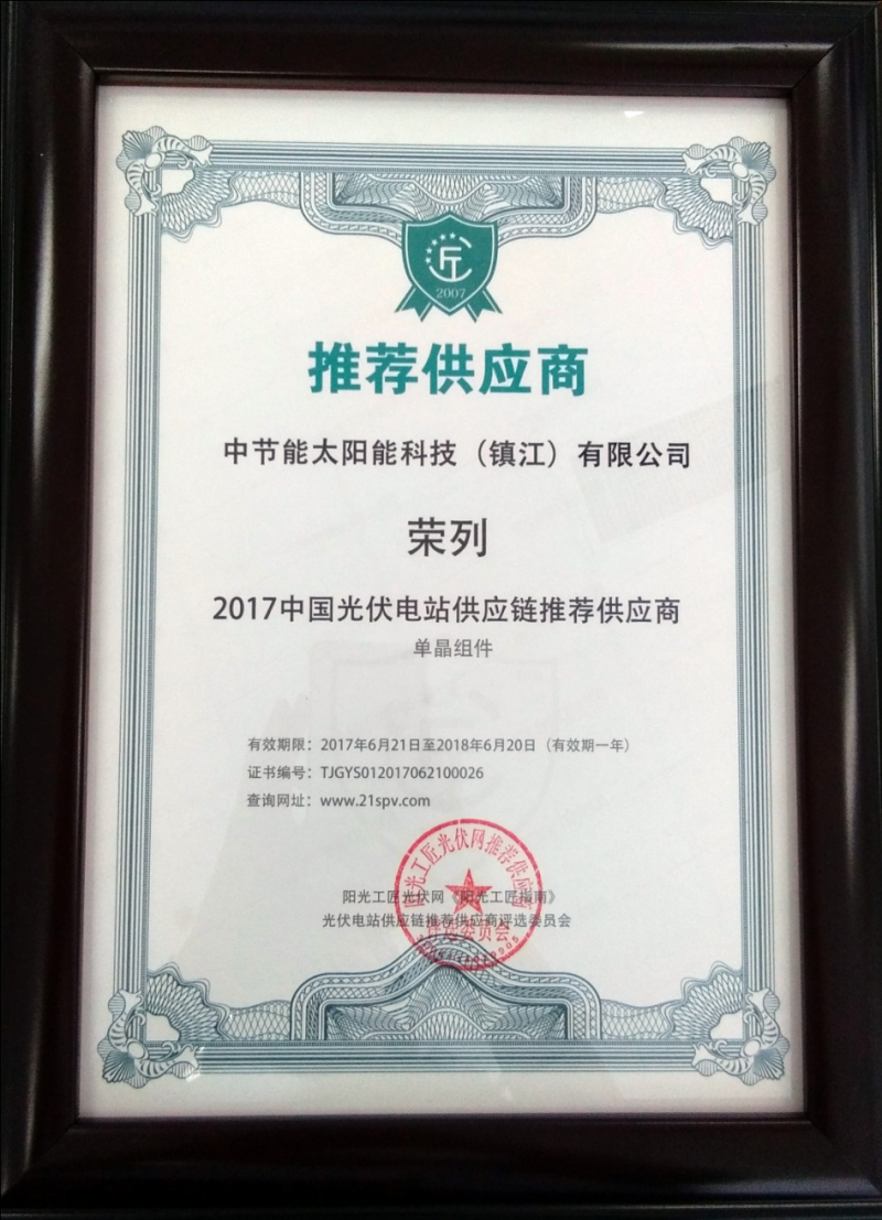 近日,中节能太阳能科技(镇江)有限公司的单、多晶组件都荣获了由阳光工匠光伏网主办的“2017中国光伏电站供应链推荐供应商”。