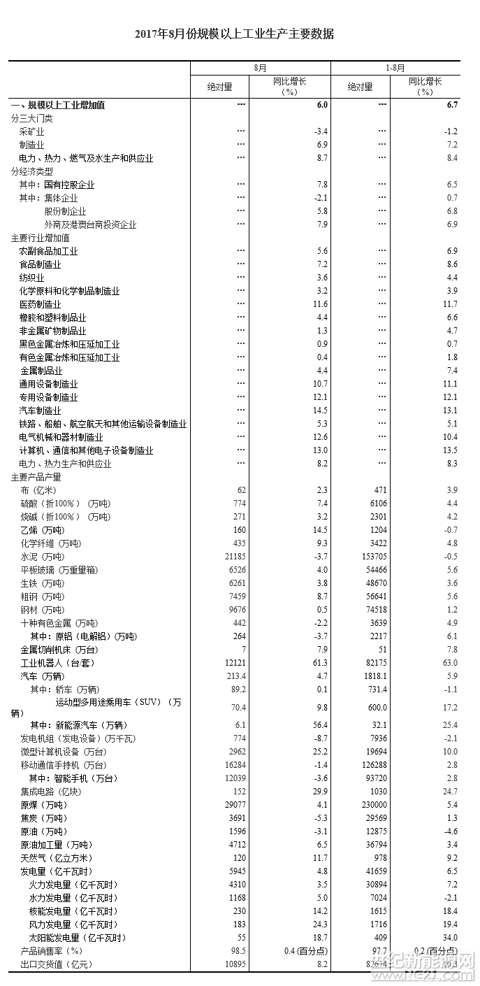 1-8月份,发电量41659.4亿千瓦时,同比增长6.5%,增速比1-7月份回落0.3个百分点。其中,火电发电量30894亿千瓦时,同比增长7.2%;水电发电量7024亿千瓦时,同比降低2.1%;核能发电量1615亿千瓦时,同比增长18.4%;风力发电量1716亿千瓦时,同比增长19.4%;太阳能发电量409亿千瓦时,同比增长34.0%。