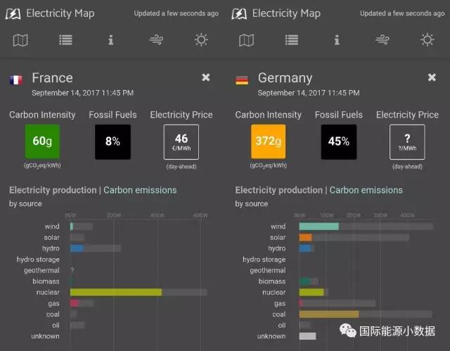根据electricityma.ogp的实时显示,在2017年9月14日当地时间11:45,德国的风电光伏的发电量大约是法国的6倍,然而每发1千瓦时电德国的碳排放为372克,法国为60克,德国的发电碳强度也正好是法国的6倍。原因很简单:此时德国还有45%的化石燃料发电(主要是煤电),而法国的化石能源发电仅占8%。