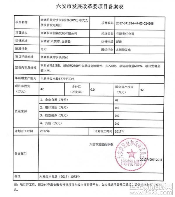 金寨县铁冲乡长河村光伏电站、铁冲乡张店村光伏电站备案古碑镇宋河村光伏电站完成备案。金寨县铁冲乡长河村光伏电站备案项目占地3.5亩,拟铺设260WP多晶硅电池组件,共720块,总装机量60KW,年新增发电量67万kWh,项目总投资42万元,项目发电全额上网。