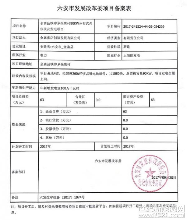 金寨县铁冲乡张店村光伏电站备案项目占地4亩,拟铺设260WP多晶硅电池组件,共1080块,总装机量90KW,年新增发电量100万kWh,项目总投资63万元,项目发电全额上网。