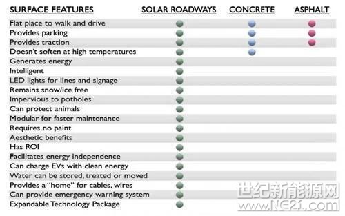 光伏发电路面设想在2006年由美国的一对科学家夫妇提出并开始研究。布鲁索夫妇发明出一种正六边形的太阳能电池板(SolarRoadway),其表面是一种超耐磨的特殊玻璃,承重最高达125吨,能保证汽车的安全行驶。Solarroadways官网对Solarroadway、混凝土、沥青三种不同路面材料做了对比。