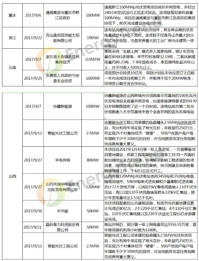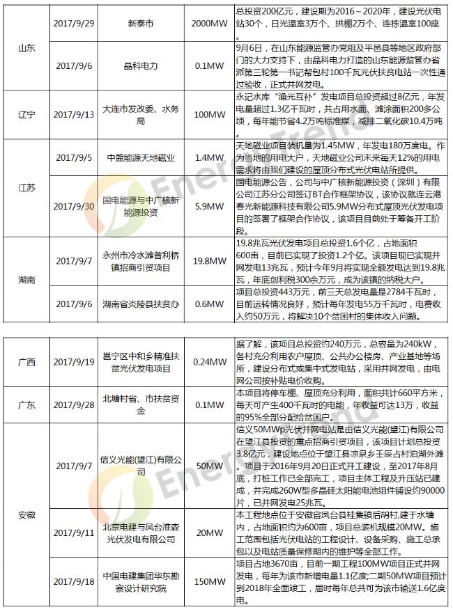 索比光伏网讯:如火如荼的八月已经过去,今年630浪潮的余浪也逐渐平息。7月底,国家能源局印发《关于可再生能源发展“十三五”规划实施的指导意见》,给出了各省2017-2020年的规模指标,至各省区后,8月底,各省根据国家分配的指标进行了二次分配,9月初,各省的指标分配陆续出台,将直接影响各省后续的光伏发电项目。9月是平息调整的一月,月前项目持续跟进落实与后续项目的规划是九月的主要工作,并搜集整理了今年9月全国各省并网的光伏项目,以供参详。(若有缺漏,欢迎联系指正。)
