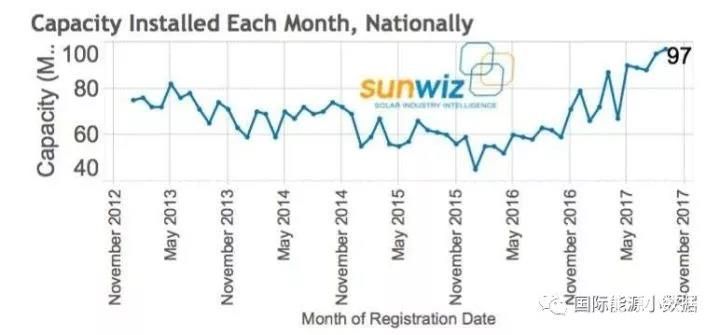 到2017年9月澳大利亚新增屋顶光伏(含居民、商业)97兆瓦,今年前9个月新增780兆瓦,预计2017年全年屋顶光伏装机超过1吉瓦。
