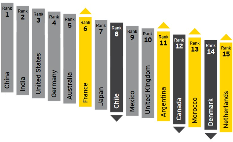 根据安永的可再生能源国家吸引力指数报告(RECAI),前三位排名依旧无变化,中国仍是第一,印度和美国分居二、三位。