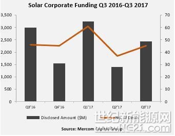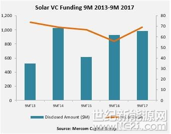 太阳能企业的风险投资(VC)资金比一年前强劲,第二季度第三季度回升,同比增长7%至2017年前九个月的9.85亿美元。