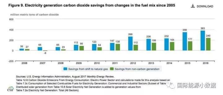 从发电领域来看,2016年的碳排放比2005年下降6.23亿吨,其中3.83亿吨(61.5%)源自天然气替代(主要是“煤改气”),2.40亿吨(38.5%)来自太阳能、风电等可再生能源。