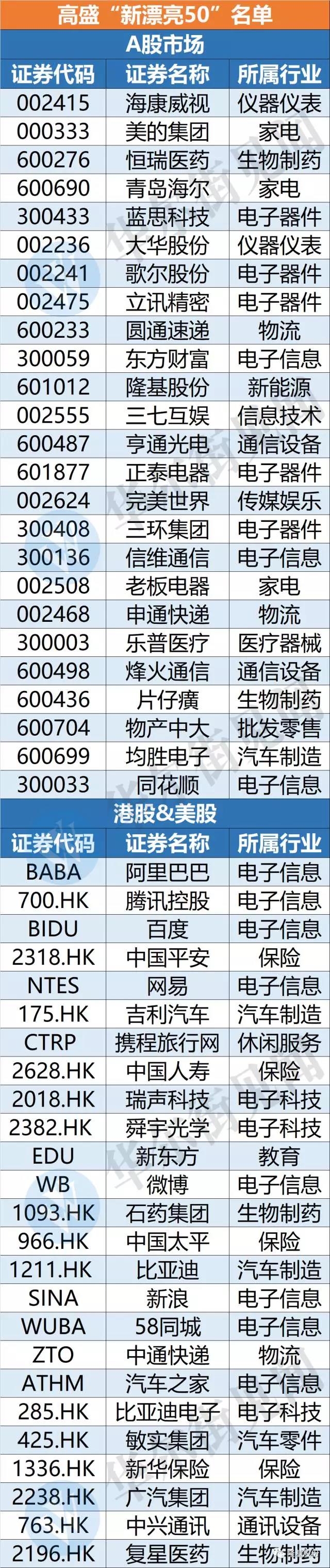 高盛给出的这份“新漂亮50”名单从18个子行业中选出,包含25只A股及25只港股和美股。这些股票所能提供的每日流动性达到4.7亿美元,2017-2019年EPS(Earnings Per Share每股收益)复合增长率达到23%,2018年P/E(市盈率)将达到19倍,PEG为0.9。