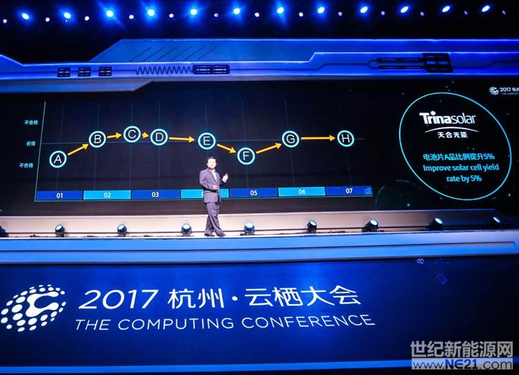 闵万里介绍道,天合光能引入ET工业大脑后,对上亿条生产数据进行实时分析,在上万个生产参数中找到最佳生产模型。人工智能为光伏产线找到了更优的生产工艺,提升电池片转换效率。