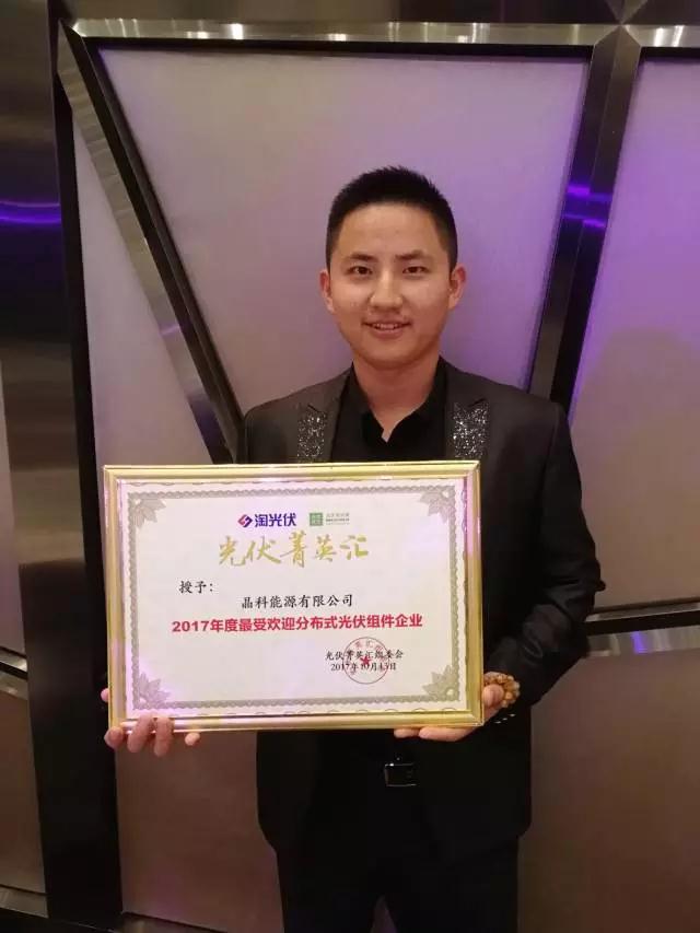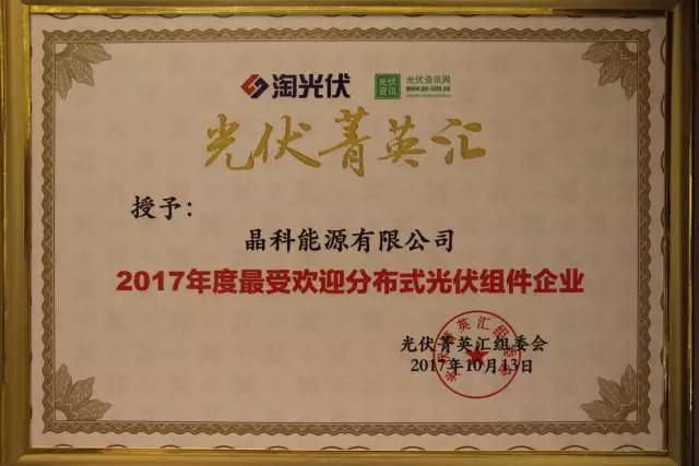 10月13日,在无锡召开的2017中国分布式光伏经销商千人大会上,全球领先的光伏企业晶科能源凭借对创新技术上的极致追求与产品品质的匠心雕琢荣膺“2017年度最受欢迎分布式光伏组件企业”称号。来自全国各地的上千位代理商共同见证了晶科能源这一业内领导品牌在分布式光伏领域取得的闪耀成就。