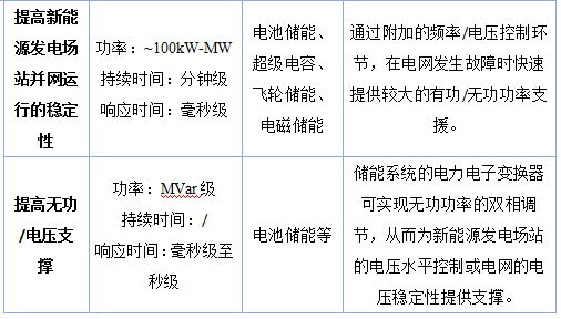 随着可再生能源发电装机容量的迅猛增长,风力、太阳能发电出力的随机性和波动性给电力系统运行带来了新的挑战。此外,由于可再生能源出力的预测误差相对较大,可再生能源发电场站的经济效益在含高比例可再生能源接入的电力系统中将会受到明显的影响。电池、超级电容、飞轮、新型压缩空气等储能系统具有快速调节的性能,可以安装在可再生能源发电场站侧,起到平滑可再生能源发电出力、提高发电出力的可控性、增强可再生能源市场竞争力等作用。在我国的北方地区,因为调峰容量不足、输电通道拥塞等原因,造成了大量弃风、弃光问题。如果在可再生能源发电场站侧安装储能系统,则可以通过储能充放电的优化控制,缓解输电阻塞和电网调峰能力限制,提高可再生能源场站的上网电量。下表对储能在可再生能源发电侧的典型应用和要求进行了总结。