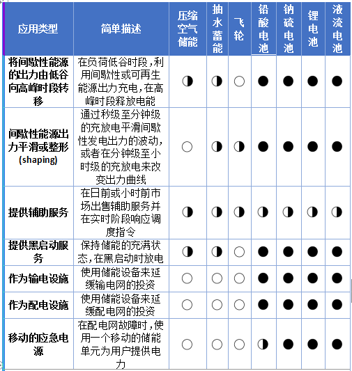 以上从发电、输配电网、用电三个方面分析了储能在电力系统中的主要应用。需要说明的是,对于一些类型的应用,储能可以安装在发电侧、输电侧或配电侧。根据美国能源部的报告,下表列出了储能典型的应用类型和几种常见储能技术适合的应用。可以看出,电池储能系统几乎适用所有列出的储能应用类型,而压缩空气储能和抽水蓄能则主要适用于规模较大的“能量型”应用。