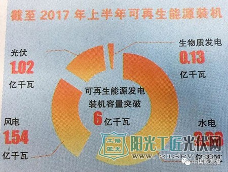 一是推动能源结构调整的作用不断增强。到2017年上半年,我国可再生能源发电装机容量突破6亿千瓦。其中,水电装机3.38亿千瓦,风电并网装机1.54亿千瓦,光伏发电并网装机1.02亿千瓦,生物质发电并网装机1330万千瓦。
