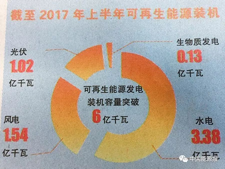 一是推动能源结构调整的作用不断增强。到2017年上半年,我国可再生能源发电装机容量突破6亿千瓦。其中,水电装机3.38亿千瓦,风电并网装机1.54亿千瓦,光伏发电并网装机1.02亿千瓦,生物质发电并网装机1330万千瓦。