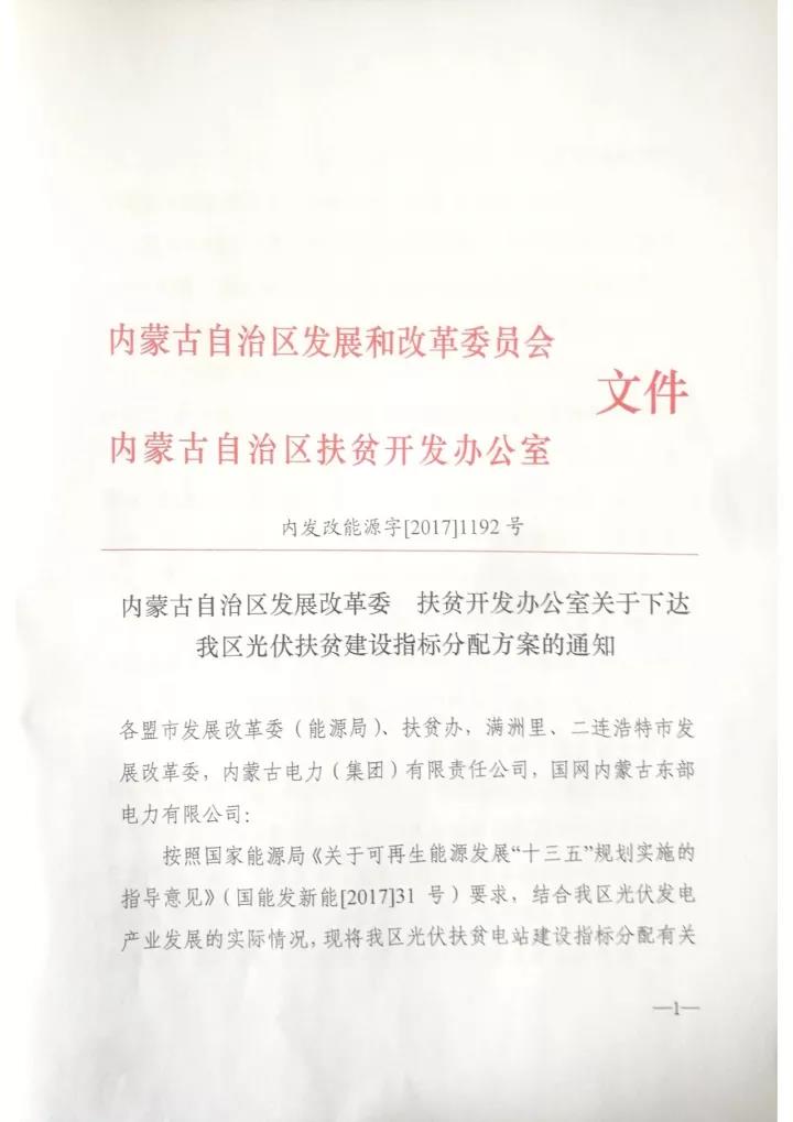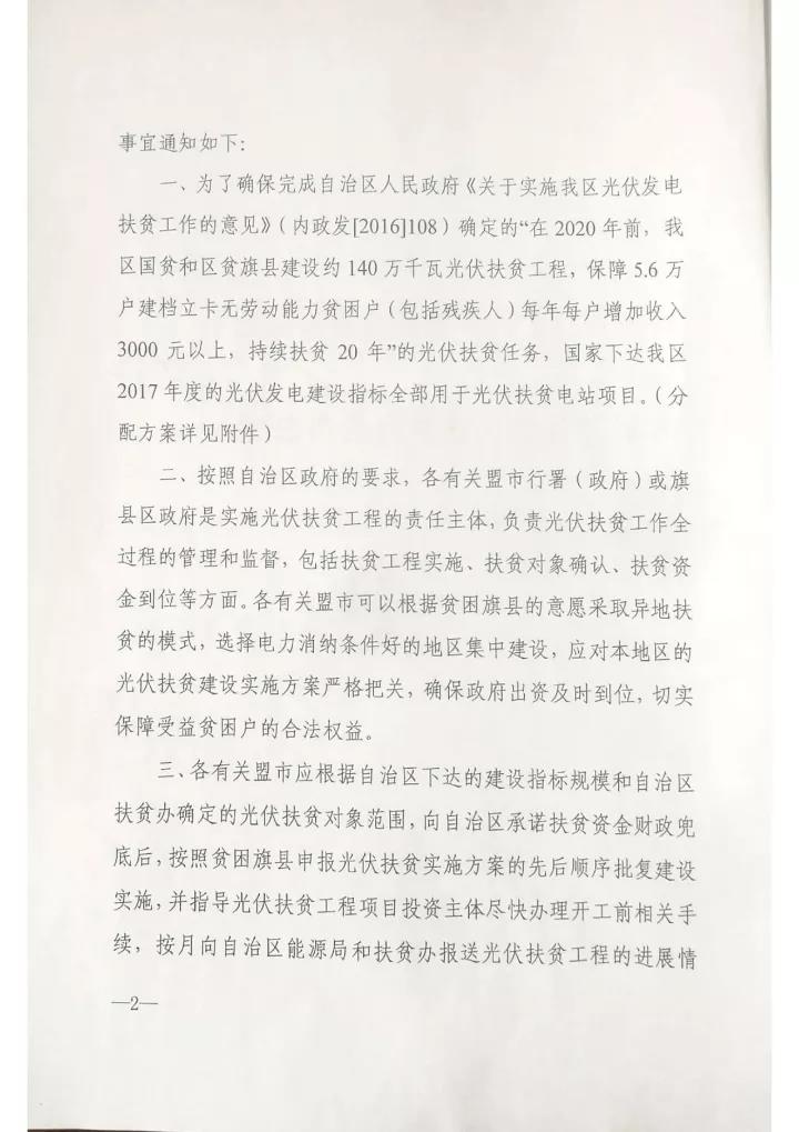 一、为了确保完成自治区人民政府《关于实施我区光伏发电扶贫工作的意见》(内政发[2016]108)确定的“在2020年前,我区国贫和区贫旗县建设约140万千瓦光伏扶贫工程,保障5.6万户建档立卡无劳动能力贫困户(包括残疾人)每年每户增加收入3000元以上,持续扶贫20年”的光伏扶贫任务,国家下达我区2017年度的光伏发电建设指标全部用于光伏扶贫电站项目。(分配方案详见附件)