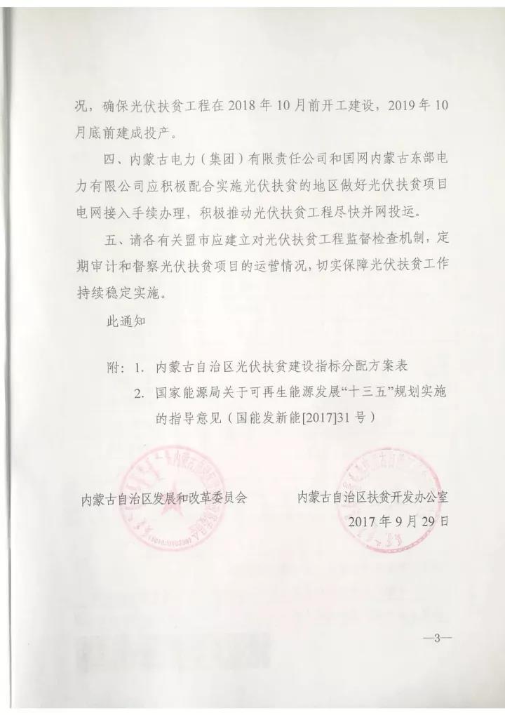 四、内蒙古电力(集团)有限责任公司和国网内蒙古东部电力有限公司应积极配合实施光伏扶贫的地区做好光伏扶贫项目电网接入手续办理,积极推动光伏扶贫工程尽快并网投运。