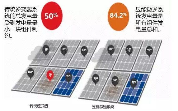微型逆变器系统中每台逆变器都具有独立的MPPT功能,可将每块组件的输出优化在最大功率点附近。由于没有‘短板’效应,组件失配、部分阴影遮挡并不会对整串组件的发电量造成影响,使得每块组件输出最大化。一般来说,在相同条件下,微逆系统比组串系统的发电量高5%~15%。