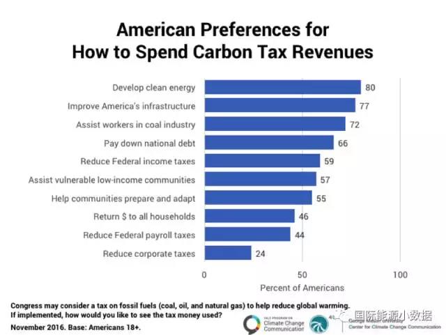 研究结果表明,美国民众每年愿意为气候变化付出177美元(置信区间为101-587美元)。如果这笔钱以碳税形式收取,每年可获得223亿美元的税收。那么,美国纳税人希望如何支出这笔税收呢?根据耶鲁的研究(如下图所示),80%的美国人希望这笔钱用于发展可再生能源,77%美国人希望用于改善美国基础设施,还有72%的美国人希望把这笔钱用于补偿煤矿工人。