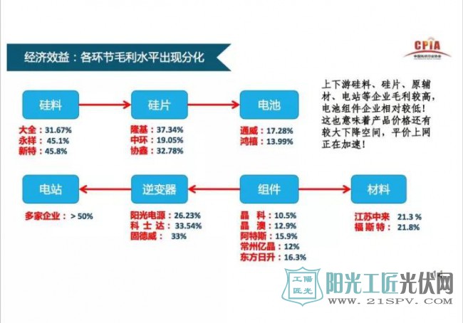 50GW的新增光伏装机容量,今年光伏全产业链都赶上了好年景,中国光伏行业协会秘书长王勃华在发言时展示了一张图片,可以更加直观地看到光伏制造业今年的日子是很好过的,尤其是硅片、硅片上游环节,逆变器企业的毛利率水平也令人羡慕。