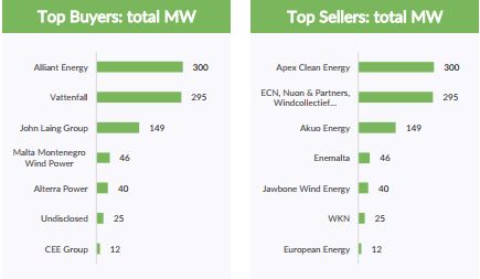 和太阳能行业一样,风能行业也出现了交易活跃度降低。相比8月的16笔交易,9月份只有7笔交易,交易容量约900兆瓦。以交易数量和容量来看,美国都占全球市场的最大份额。有意思的是,风能行业的几乎所有容量交易都是发展阶段的资产。