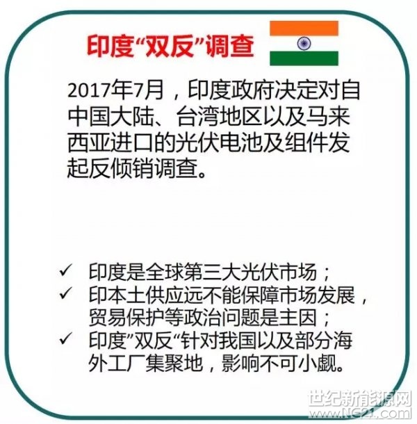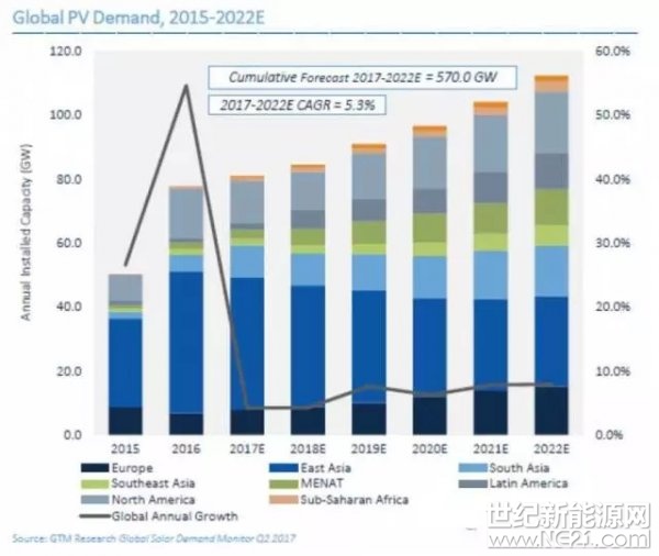 ——Energytrend:2017年光伏装机超过90GW,其中中国大陆48GW、美国12.5GW、印度10GW、日本6.8GW。