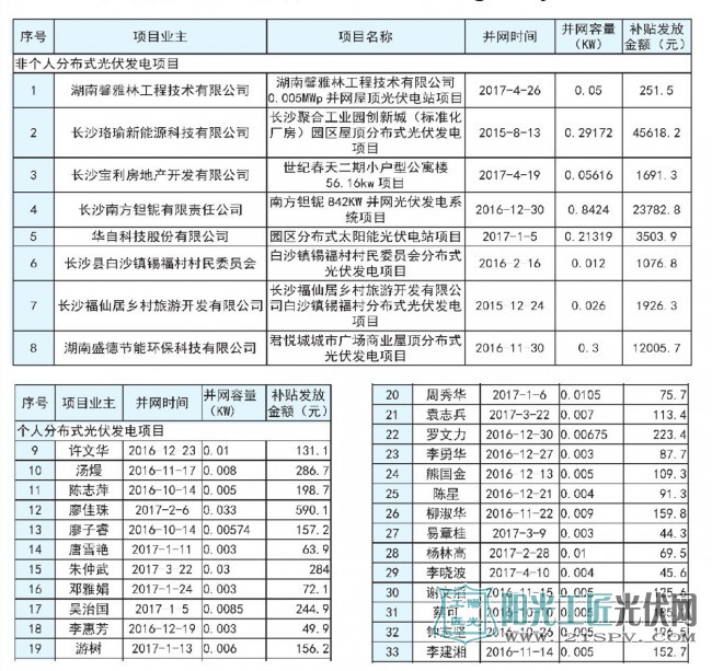 现将2017上半年度长沙市分布式光伏发电拟补贴项目公示如下。如有异议,请在公示之日起5个工作日内向长沙市能源局、长沙市财政局书面实名提出。