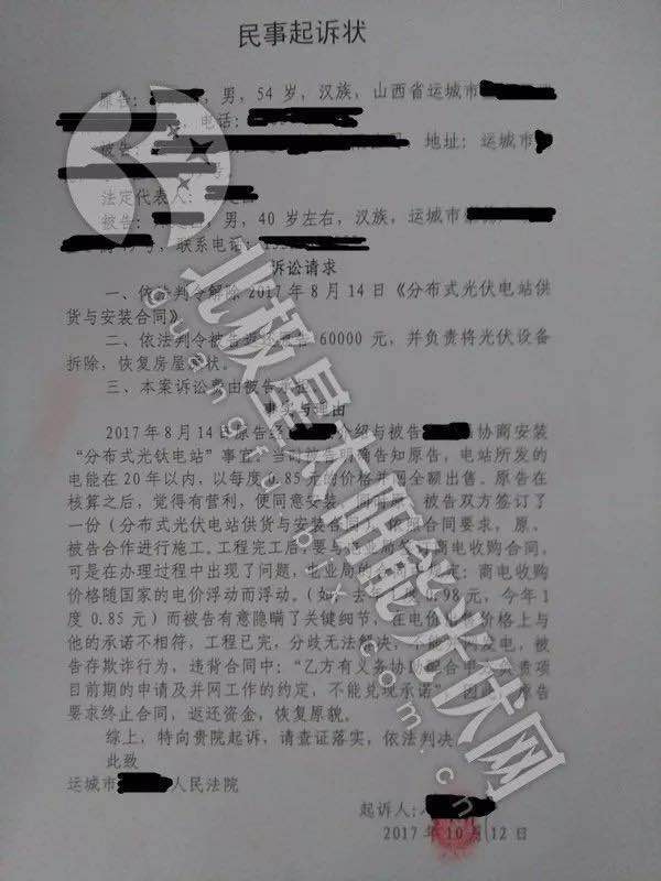 索比光伏网讯:10月19日晚上8点半,记者接到山西运城一位名为王一顺(化名)的光伏经销商的电话,称自家公司在为当地民众张宝来(化名)安装了10KW的光伏电站后,因电力局合同中“商电收购价格随国家的电价浮动而浮动”的规定而产生了分歧,张宝来认为王一顺存在欺诈,于是将王一顺告上了运城市某区人民法院。